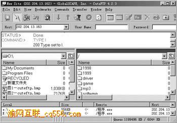 添加了站點(diǎn)之后,在站點(diǎn)管理窗口中選擇一個(gè)FTP(注意只能選擇一個(gè)FTP站點(diǎn)),與之建立連接。連接到服務(wù)器以后,CuteFTP的窗口被分成左右兩個(gè)窗格。左邊的窗格顯示本地硬盤的文件列表,右邊的窗格顯示遠(yuǎn)程硬盤上的文件列表。文件列表的顯示方式和Windows的資源管理器完全一樣,如圖2所示。