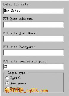 1、運(yùn)行CuteFTP,在"FTP Site Manager(FTP站點(diǎn)管理)"窗口中,單擊"New"按鈕,就會(huì)彈出一個(gè)如圖1所示的對(duì)話框。