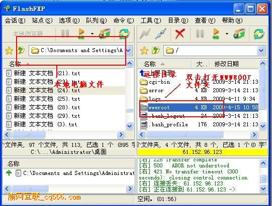 4.選擇您要上傳的文件,并點(diǎn)鼠標(biāo)“右鏈”->“傳送”,將文件傳到到WWWROOT目錄里. 這時(shí)在隊(duì)列欄里會(huì)顯示正在上傳及未上傳的文件, 當(dāng)您的文件上傳成功完成后,在命令欄里會(huì)出現(xiàn)“傳送完成”的提示,此時(shí)在過程目錄欄里就可以看到您上傳的文件了。